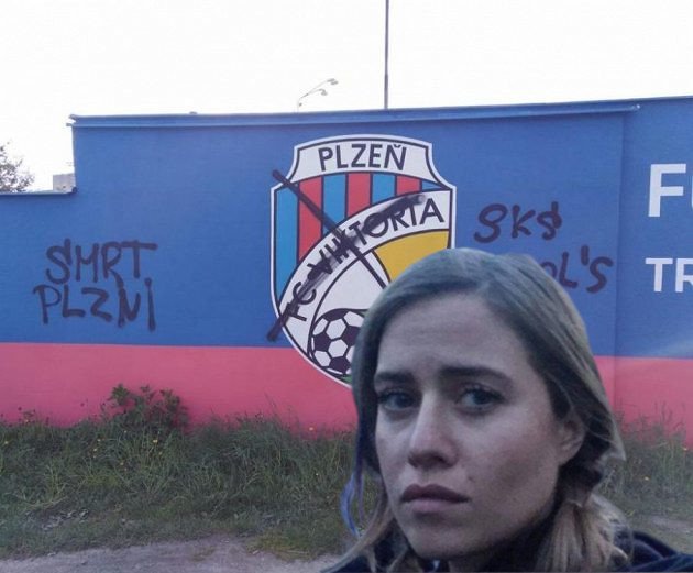 Figurína oběšence v plzeňském dresu na jedné z pouličních lamp. Posprejované budovy, ploty i zdi, přeškrtnutý znak Viktorie Plzeň, nechutné nápisy jako například v „neděli chcípnete“.