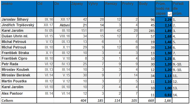Je důležité podotknout, že žádný z předchozích 9 koučů (Michal Petrouš 2x) po roce 2010 se těmto posledním 3 trenérům výsledkově ani nepřiblížil. Což si můžeme i ilustrovat na následující tabulce, která ukazuje výsledkovou úspěšnost všech trenérů v lize od roku 2005 seřazenou dle průměrné bodové úspěšnosti v zápase.