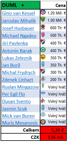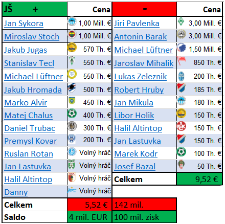 3. Muris Mešanovič k nám opravdu přestoupil půl roku před koncem smlouvy i dle webu Jihlavy "FC Vysočina obdrží od Pražanů finanční kompenzaci a hráčskou náhradu. Součástí dohody je rovněž podíl z dalšího Mešanovičova přestupu." V tomto případě jsem informaci převzal z transfermarkt.de a již dále nekontroloval. Těch 8 milionů zní celkem reálně. Tak jako tak, pokud se odečte ušetřená částka za Mihalíka, tak ty celkové částky sedí.